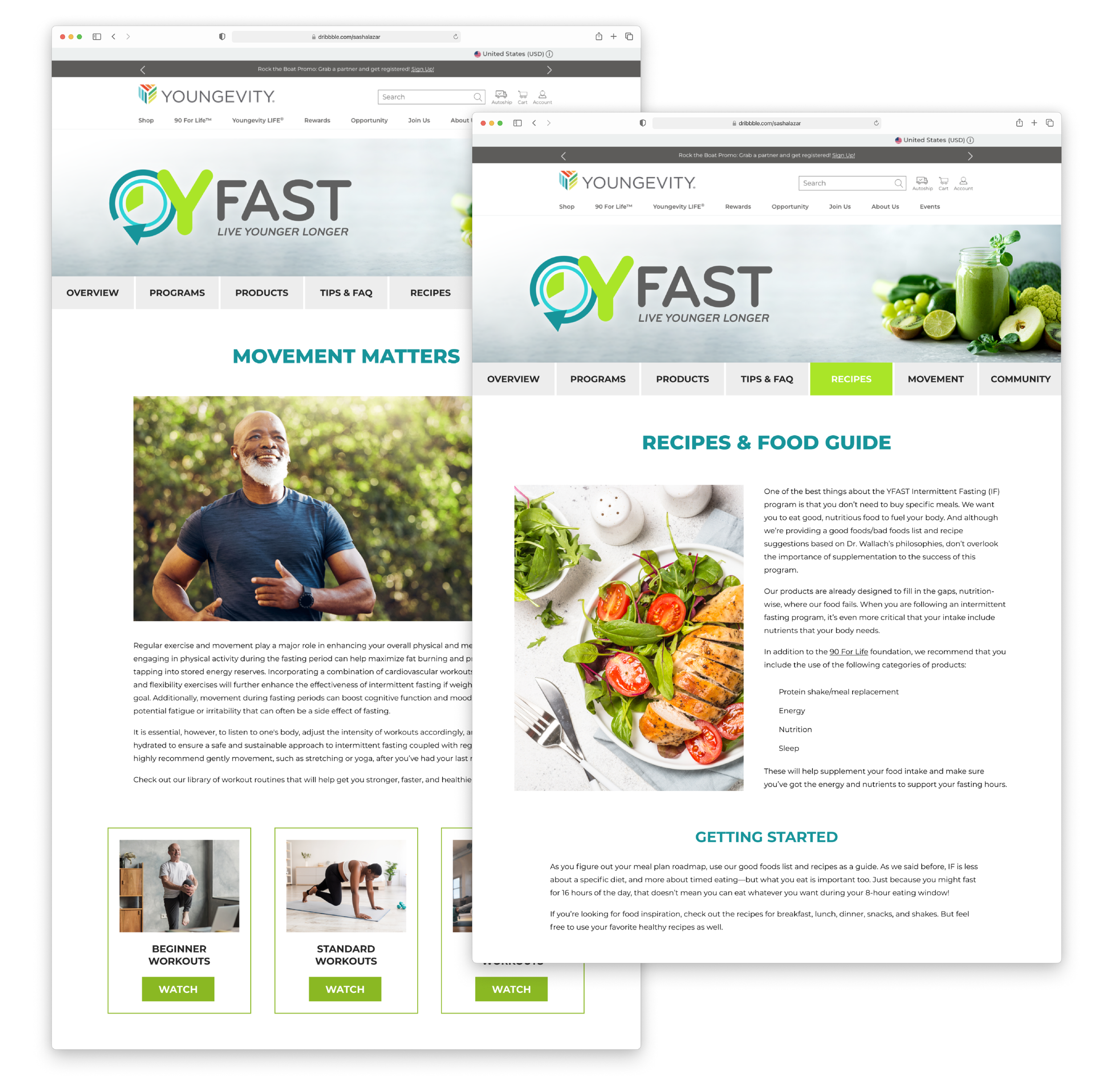 YFast is an extension of the Youngevity brand promoting the company’s intermittent fasting diet program. I was responsible for initial brand ideation, marketing strategy & execution, and product design for an expansive mini-website. Throughout development, I kept simplicity and ease-of-use foremost in mind to cater to the needs of our user base.